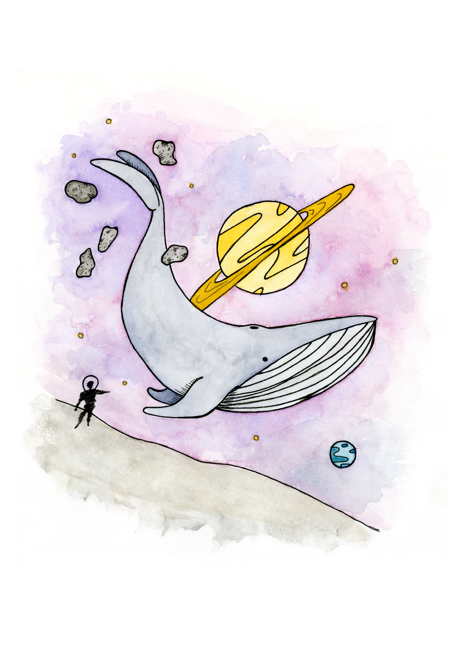 India-ink and watercolor illustration of a human encounter with the elusive Star Whale. The Star Whale is a gentle giant exploring the great expanse of outer space meeting with its pod once a year for a mating and social ritual.